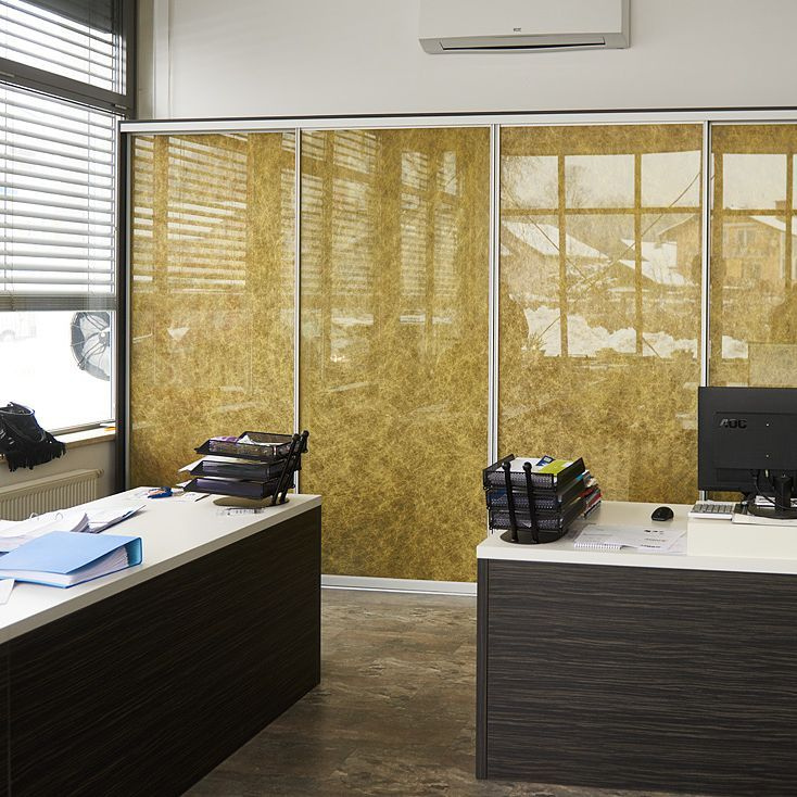 Тканевый триплекс состоит из двух и более стекол, соединенных полимерной пленкой и тканью. Применение узорчатого материала позволяет создавать уникальные рисунки на изделиях для интерьера (перегородках, металлоконструкциях, дверях, мебели).